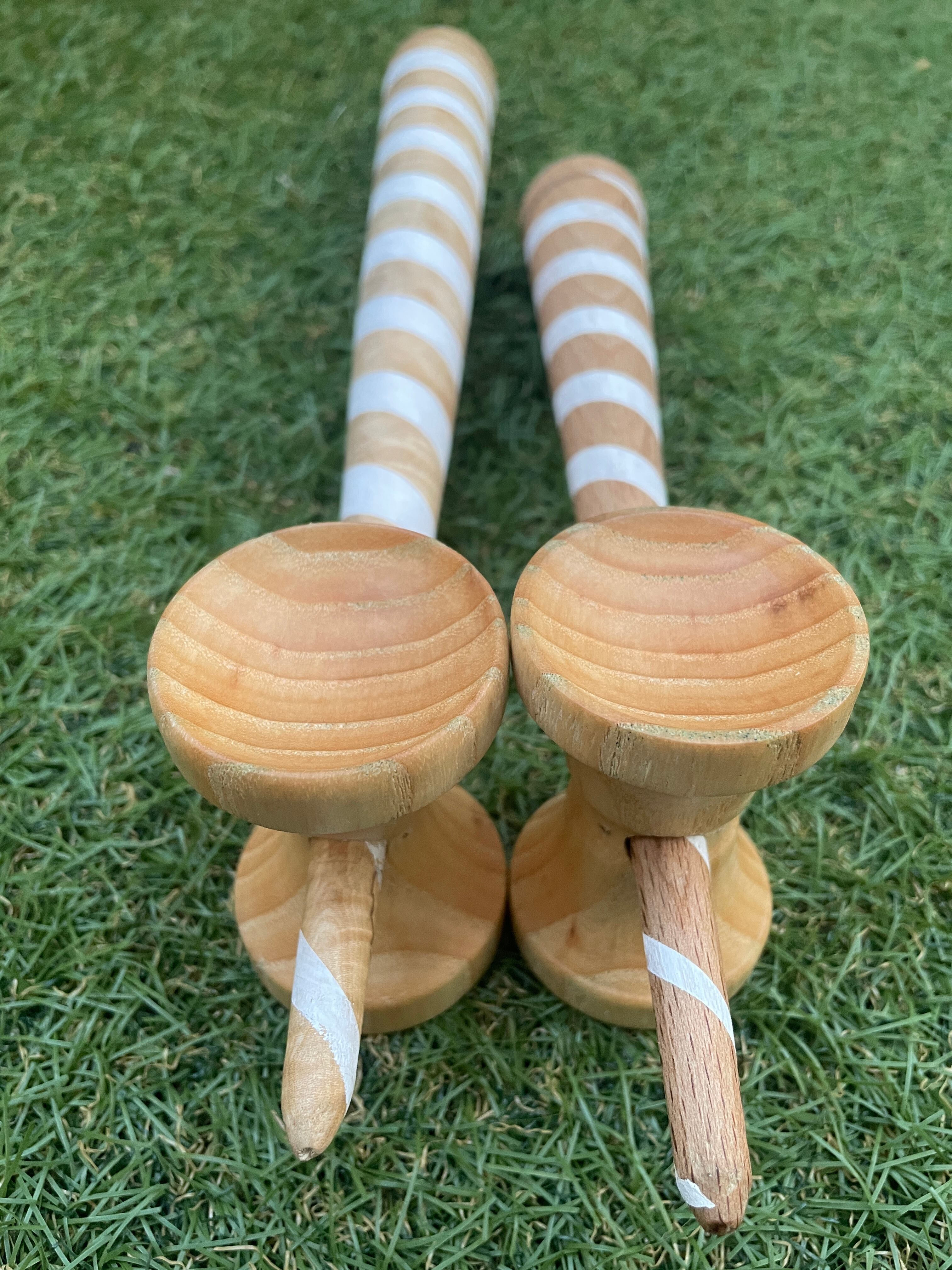 「クラッチ専用けん玉 2本セット」は、クラッチという技のためにデザインされた長いけん玉です。この特別なけん玉は、技を極めるためのための最適なツールとして、友達とトリックを楽しむお手伝いをします。通常のサイズより長い2本のけん玉なので大勢の前でのパフォーマンスやダブルスにはもってこいです。