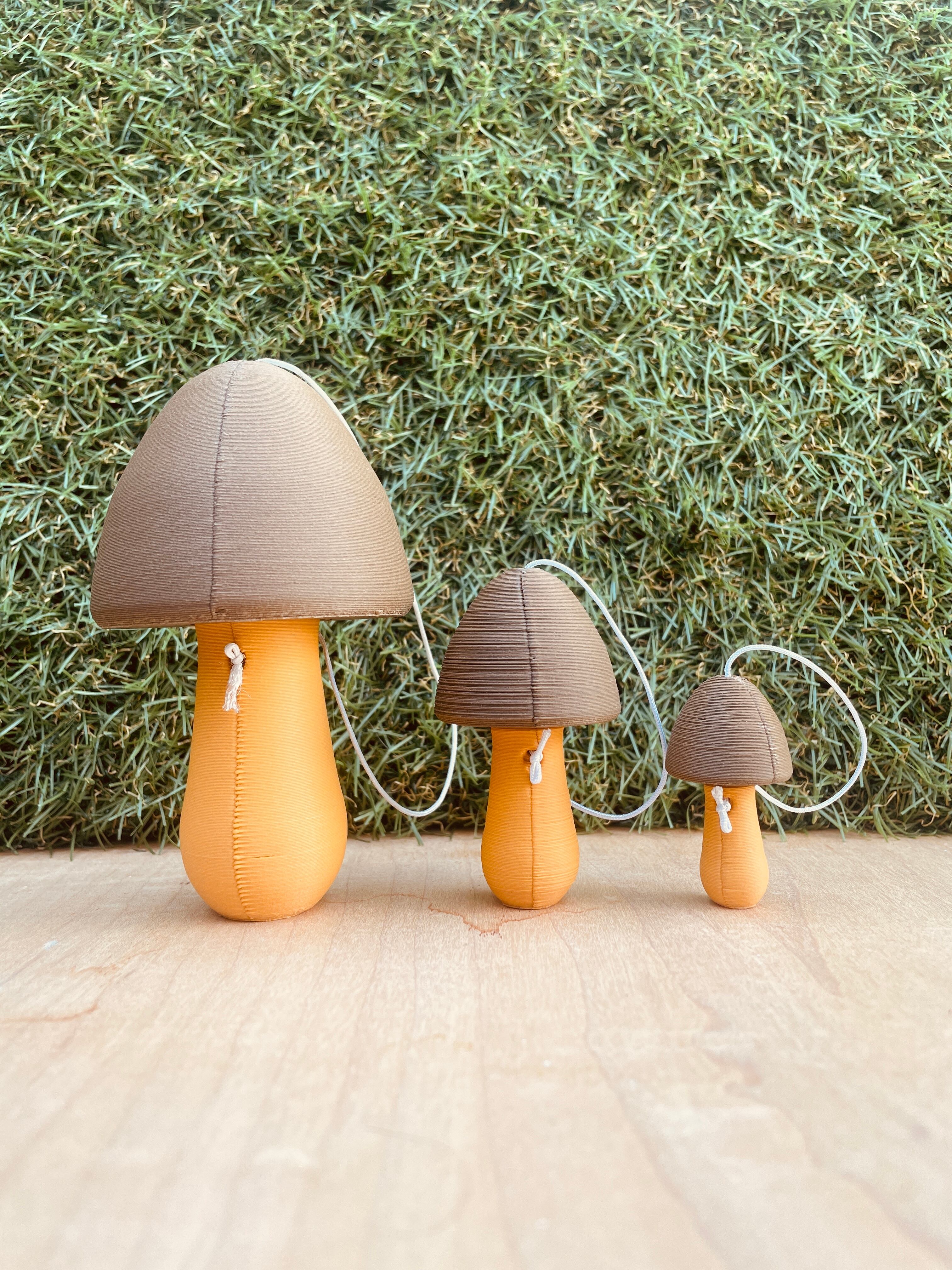 「きのこヤンクけん玉サイズ③大」は、愛らしいきのこ形状を持つ特別なけん玉です。このサイズは、他のサイズよりも一回り大きく設計されており、ダイナミックなヤンクという技にぴったりです。画像の中に3サイズのきのこけん玉をのせたものがあります。このけん玉は1番大きいものになります。